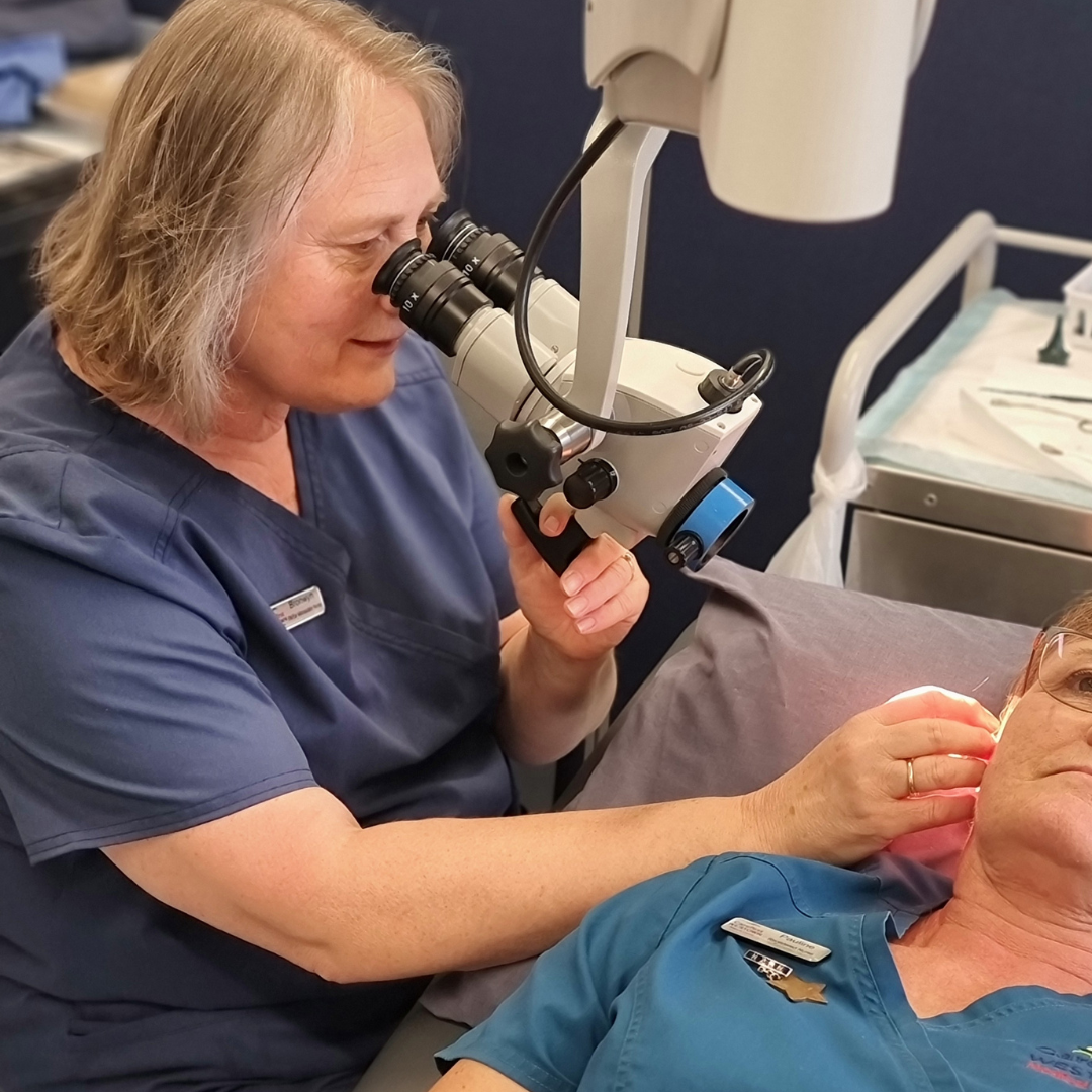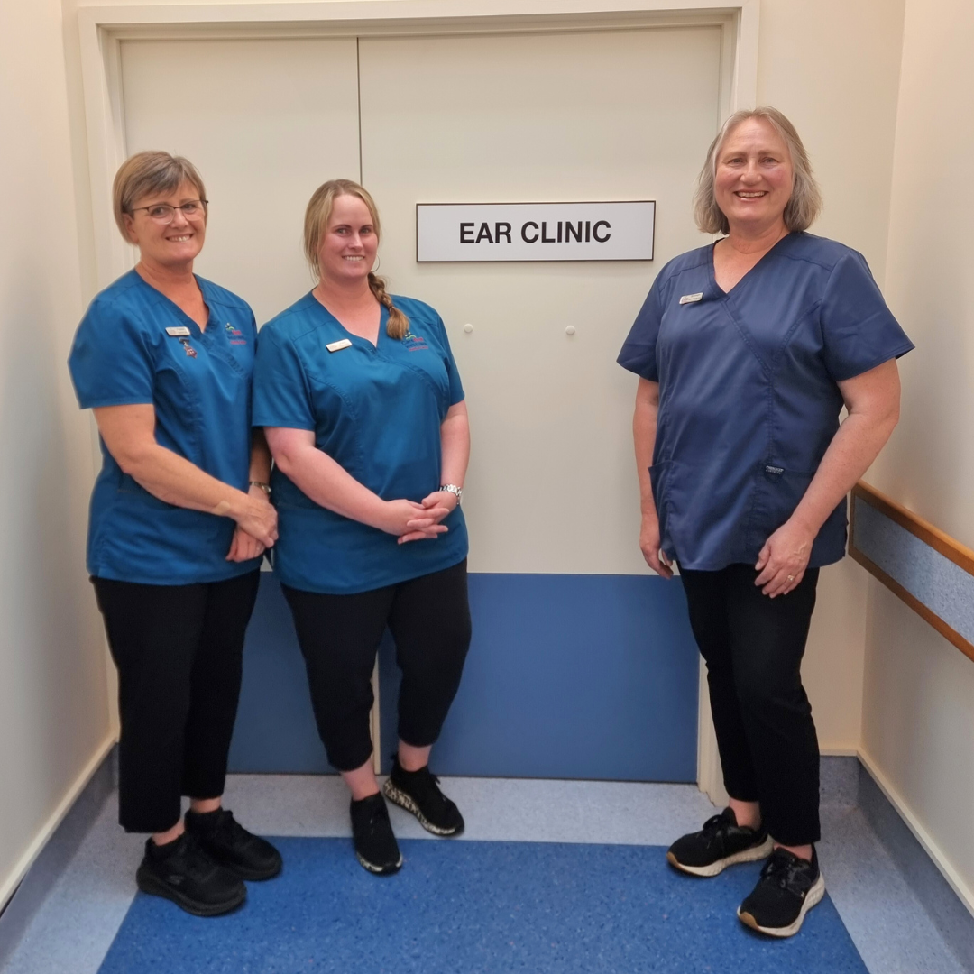 Pictured L-R: Pauline, Flynn and Bronwyn from the aural microsuctioning team; Bronwen and Pauline demonstrate the investigation part off an aural microsuctioning appointment.